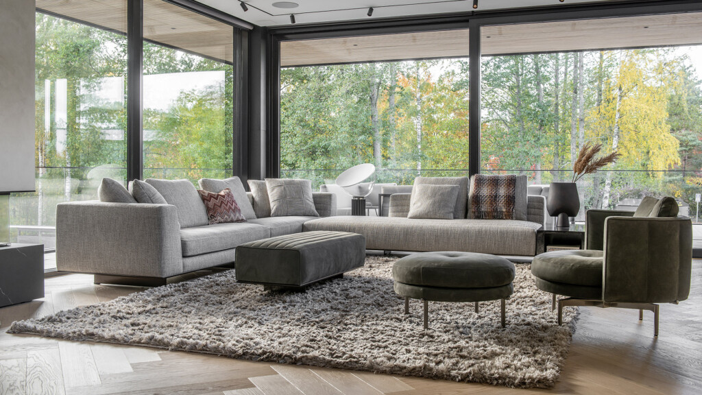 Asiakkailla oli jo pidemmän aikaa ollut etsinnässä se täydellinen sohva, joka täyttäisi kaikki tarpeet sekä toiveet niin käytännöllisyydessä kuin ulkonäössäkin. Aktiivinen etsintä sekä odotus palkittiin kun italialaisen Minotin mallistosta löytyi kaikki toiveet täyttävä, modulaarinen Roger-istuinjärjestelmä. Roger-mallisto kuvastaa brändille ominaisia tunnusmerkkejä: korkeatasoista kädenjälkeä, puhdaslinjasta muotoilua sekä äärimmäistä käytännöllisyyttä. Rodolfo Dordonin suunnittelema sohvakokonaisuus on pitkälle kustomoitavissa vastaamaan jokaisen asiakkaan sekä tilan tarpeisiin, mikä näkyi myös tämän kohteen lopputuloksessa.