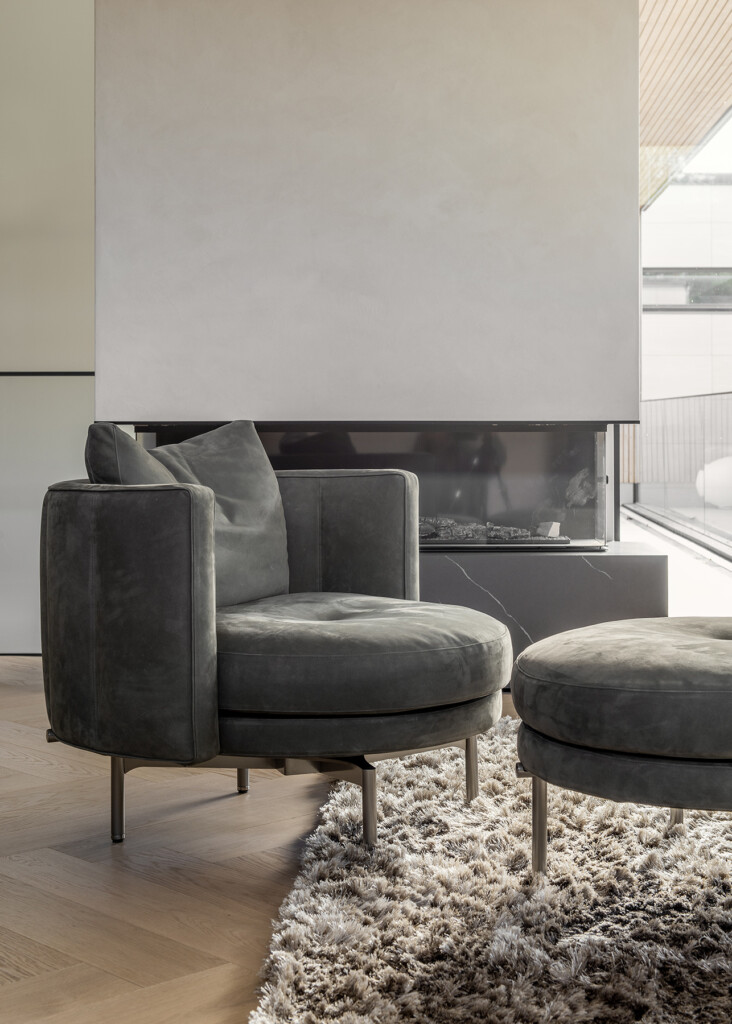 Perheen muuttaessa juuri valmistuneeseen, näyttävään omakotitaloon, kaivattiin kalustehankintoja aina olohuoneen sohvaryhmästä makuuhuoneiden säilytysratkaisuihin. Suunnittelijan ja asiakkaiden jo monta vuotta kestänyt lämmin suhde oli mahtava lähtökohta kattavalle projektille, jossa uusia ratkaisuja kaivattiin kodin useisiin eri huoneisiin. Modernia tyyliä edustavaan taloon tahdottiin tuoda lämmintä ja ajatonta tunnelmaa pehmeillä materiaaleilla sekä murretun hillityillä sävyvallinnoilla.