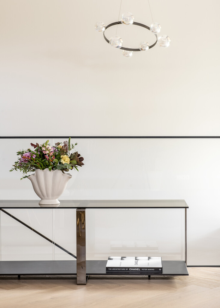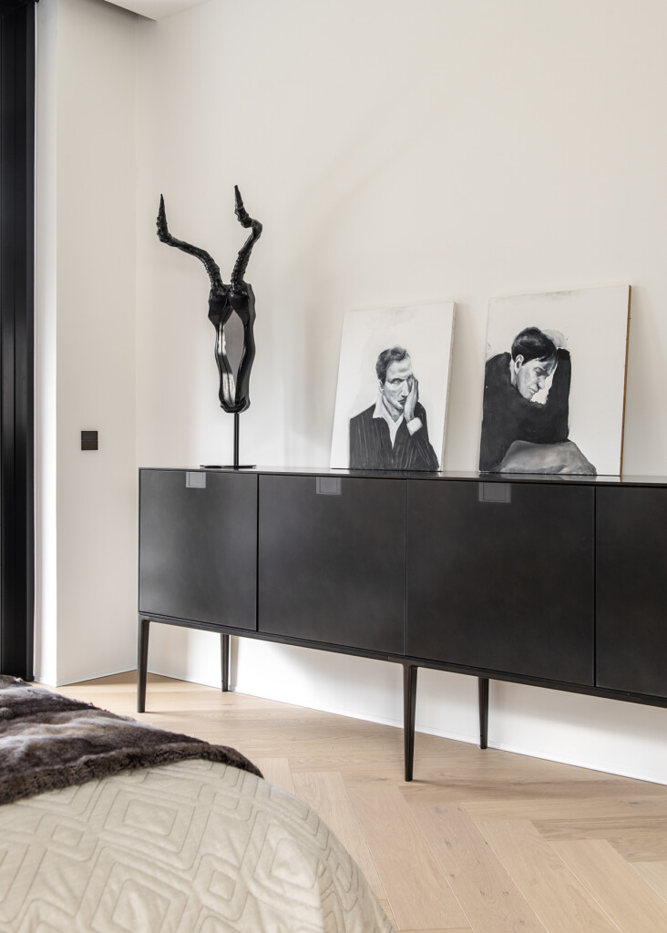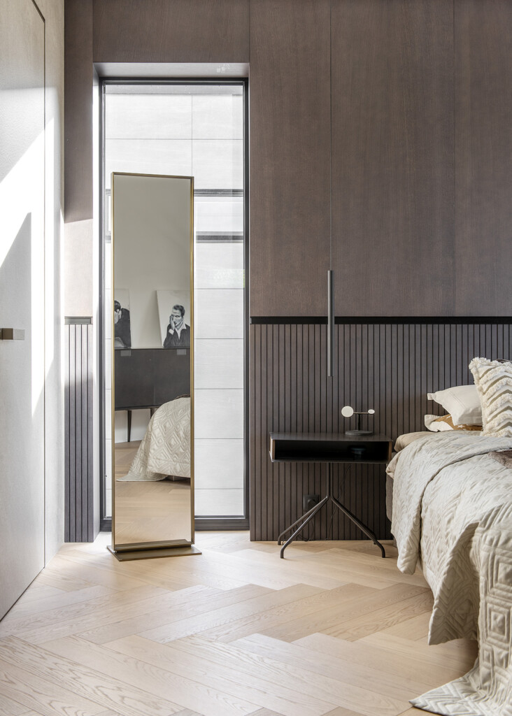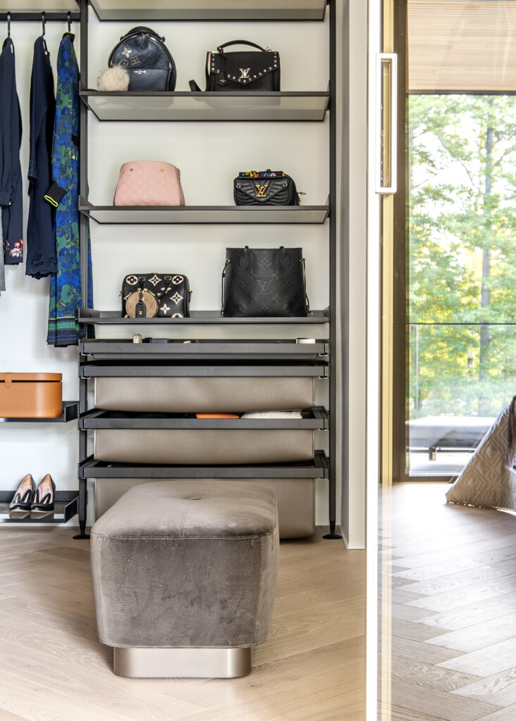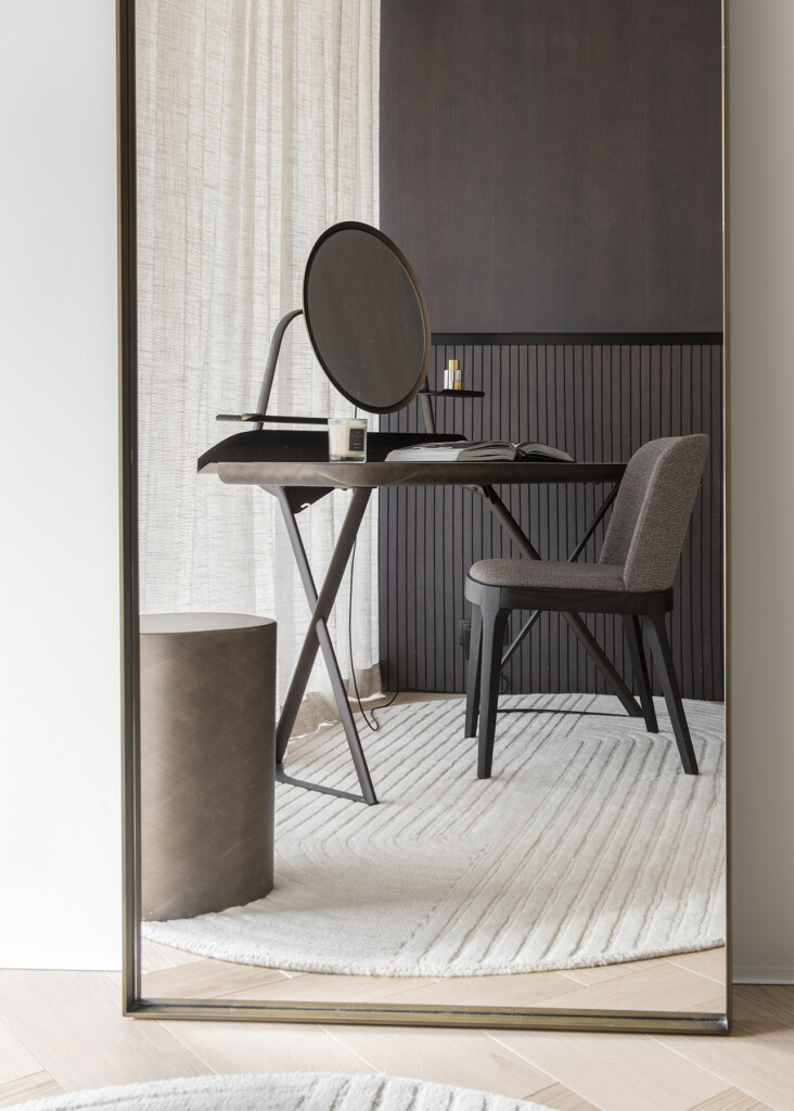 Olohuoneen maanläheinen sävymaailma saa jatkumoa vaatehuoneessa. Makuuhuoneen yhteyteen aukeaa tilava vaatehuone, jonka keskiöön asetettiin Jacques-rahi Minotin valikoimasta. Rahin jalka on pronssattua metallia ja sen istuinosa verhoiltiin harmaansävyiseen samettikankaaseen. Makuuhuoneeseen kaivattiin myös lisää kaappitilaa – Maxalton Alcor-konsoli palvelee tätä tarvetta kätkien neljän oven sisälle kaiken tarvittavan. Konsolin tumma väri luo valkoisen seinän sekä puulattian välille vaikuttavaa sävyjen kontrastia.