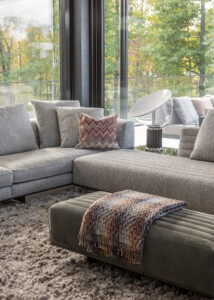Sohvakokonaisuus muodostuu kolmesta moduulista sekä irrallisesta suorakaiteen muotoisesta rahista. Toiminnallisen ja hienostuneen kokonaisuuden viimeistelee sohvan päätyyn sekä moduulien väliin asetetut kiinteät sivutasot. Sohva on verhoiltu Platino-sävyiseen Natte-kankaaseen, rahin verhoilu on Nabuki-nahka sävyssä Muschio. Sohvan lisäksi olohuoneeseen valikoitui Minotin Torii-nojatuolit sekä samaan mallistoon kuuluva rahi. Onnistuneen suunnittelun tuloksena syntyi lämmin kokonaisuus, joka tarjoaa täydellisen tilan yhteiselle ajanvietolle sekä rentoutumiselle.