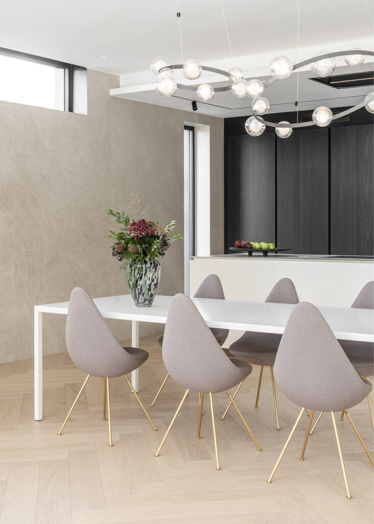 Hienostuneet kaluste- ja materiaalivalinnat saivat inspiraationsa talon upeista pintamateriaaleista sekä sävyjen vuoropuhelusta. Skannon sisustusarkkitehti Zeina Naso oli mukana projektissa aina talon rakennusvaiheesta lähtien ja halusi tuoda upouuteen kivitaloon eleganttia sekä lämmintä kodin tunnelmaa.