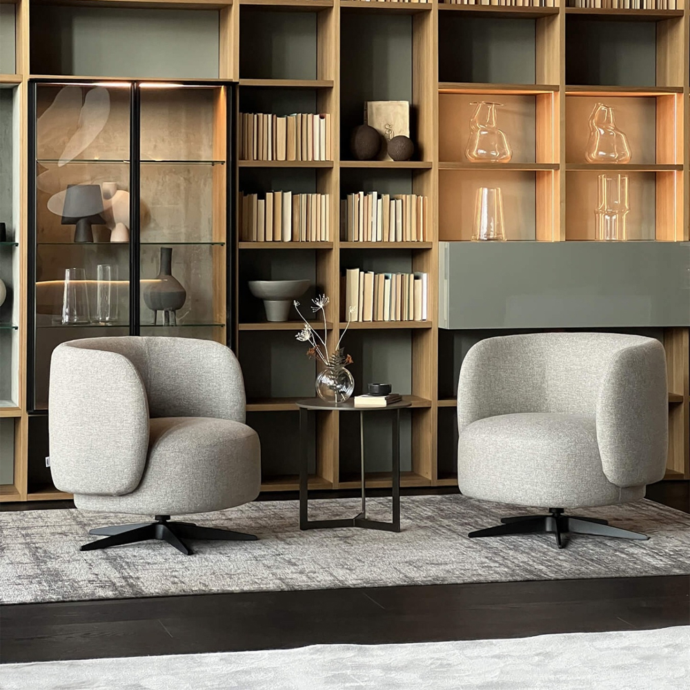 Pierattelli Architetturen suunnittelema Miki on elegantti nojatuoli, jossa yhdistyvät pehmeys, mukavuus ja dynaaminen muotoilu. Sen suuri istuintyyny on upotettu kaarevaan, pehmustettuun kuoreen, joka toimii sekä selkä- että käsinojana. Nojatuoli kompakti koko, korkea selkänoja ja keskelle asettuva alumiinijalusta tekevät Mikistä yleisilmeestä kevyen ja tyylikkään. Pyörivä mekanismi lisää istumismukavuutta ja helpottaa vuorovaikutusta suuremmassa tilassa. Saatavilla kangas-, nahka- tai vegaaninahkaverhoilulla.