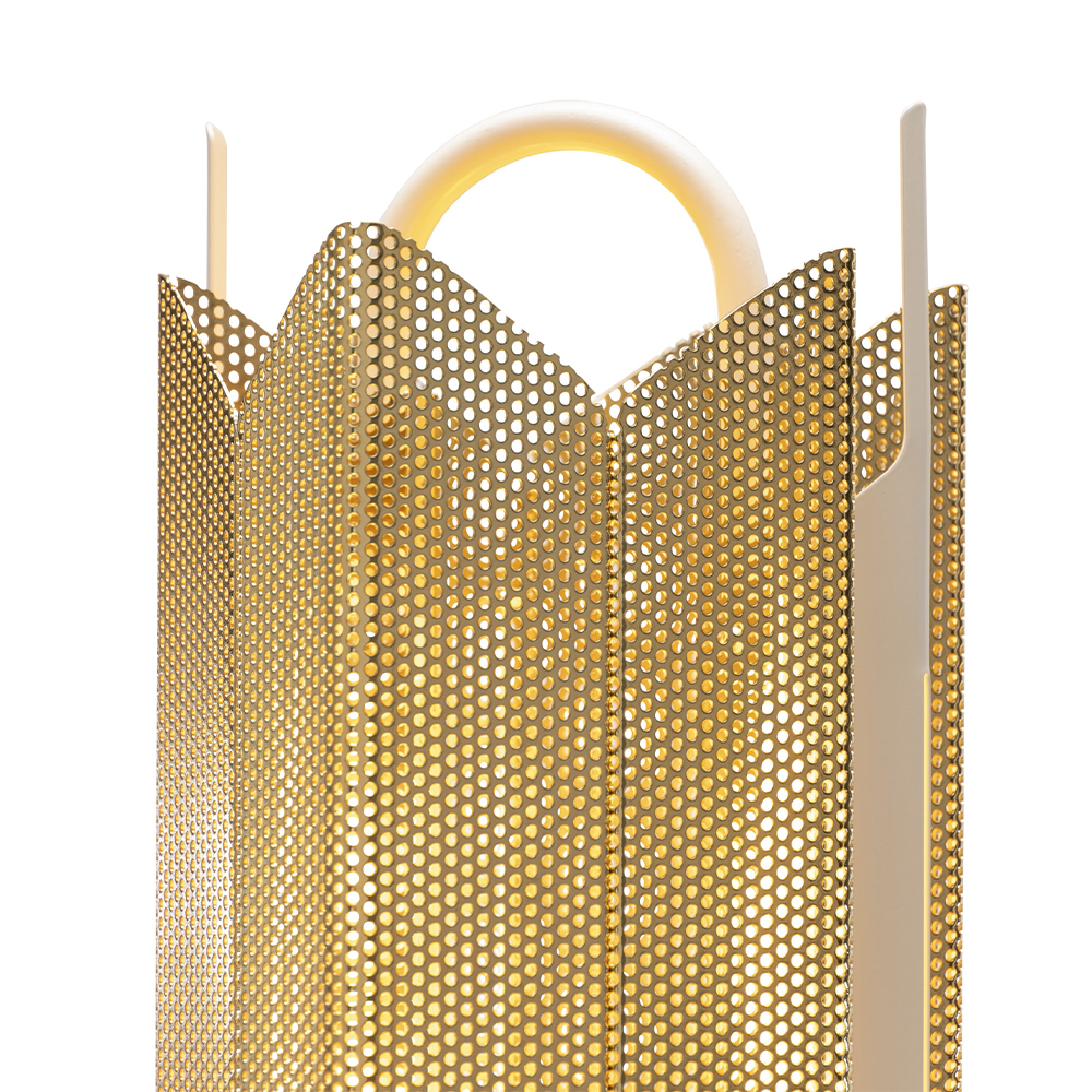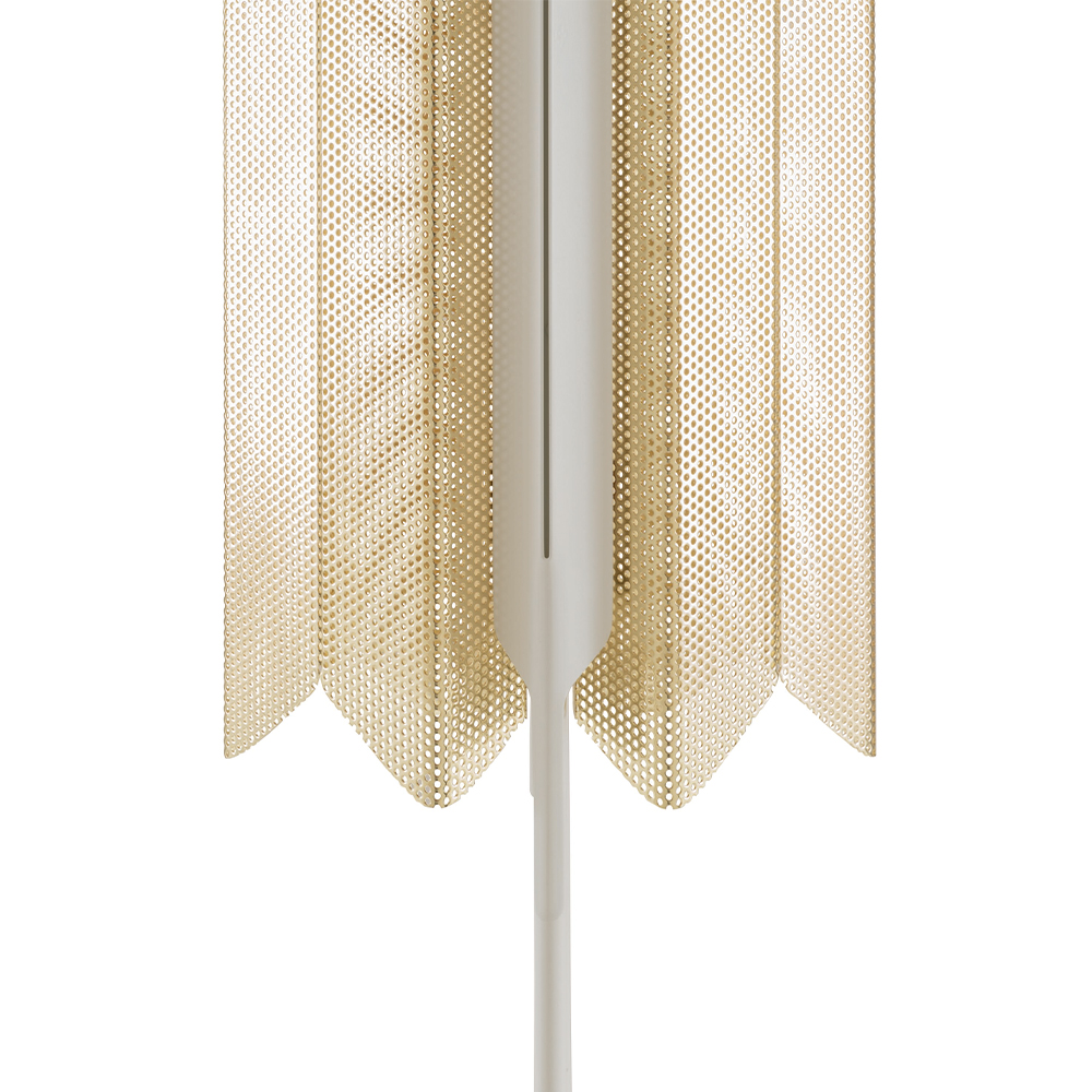 UusiNäyttävä Nef-lattiavalaisin rakentuu epoksilakatusta teräsrakenteisesta varresta ja varjostimesta, joka on messinkipintaista rei’itettyä teräslevyä. Valaisin on viimeistelty helmiäisellä, beigeen taittavalla viimeistelyllä.