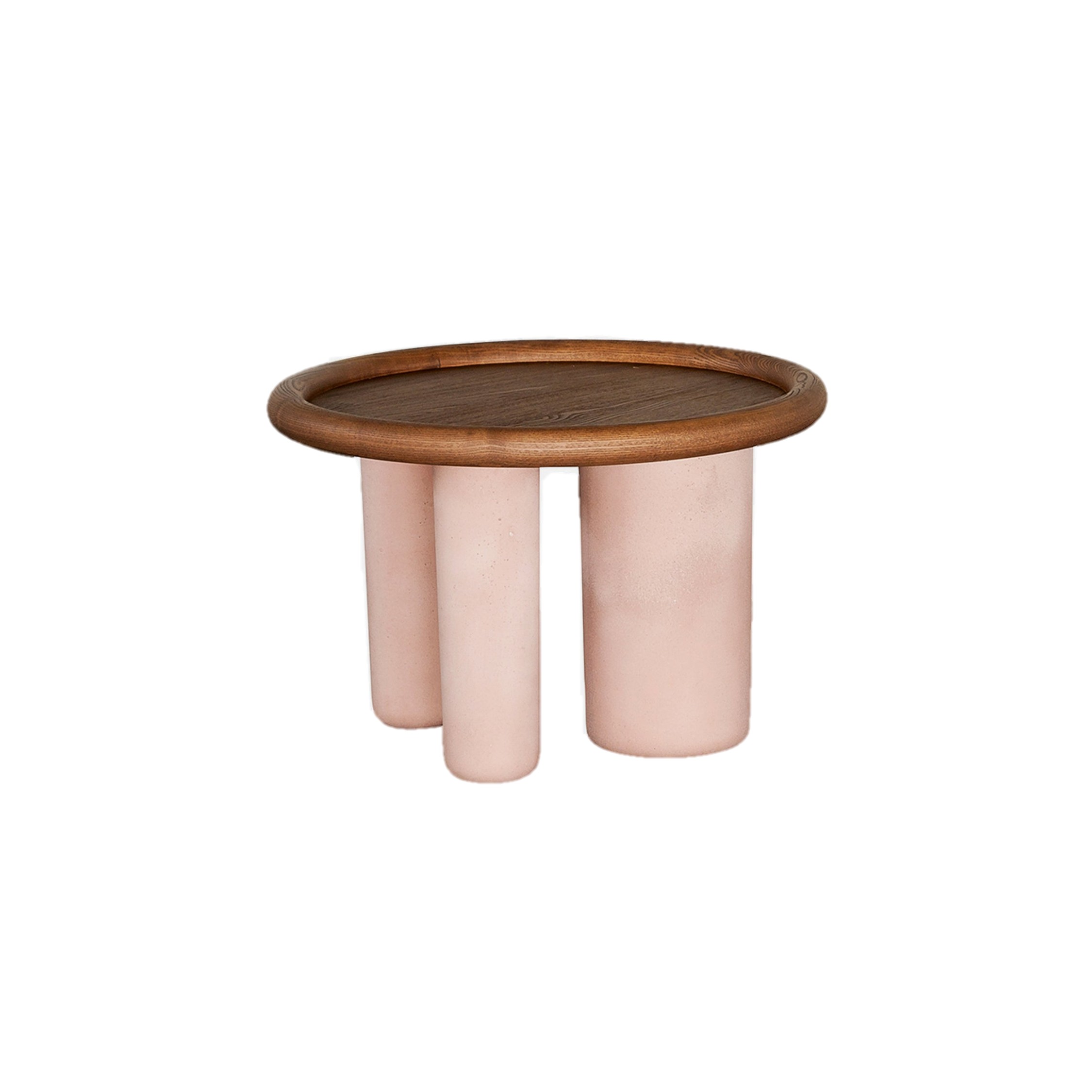 Materiaali, väri: kansi on massiivipuuta pähkinän sävyssä ja jalat ovat sementtiä pinkin sävyisenä