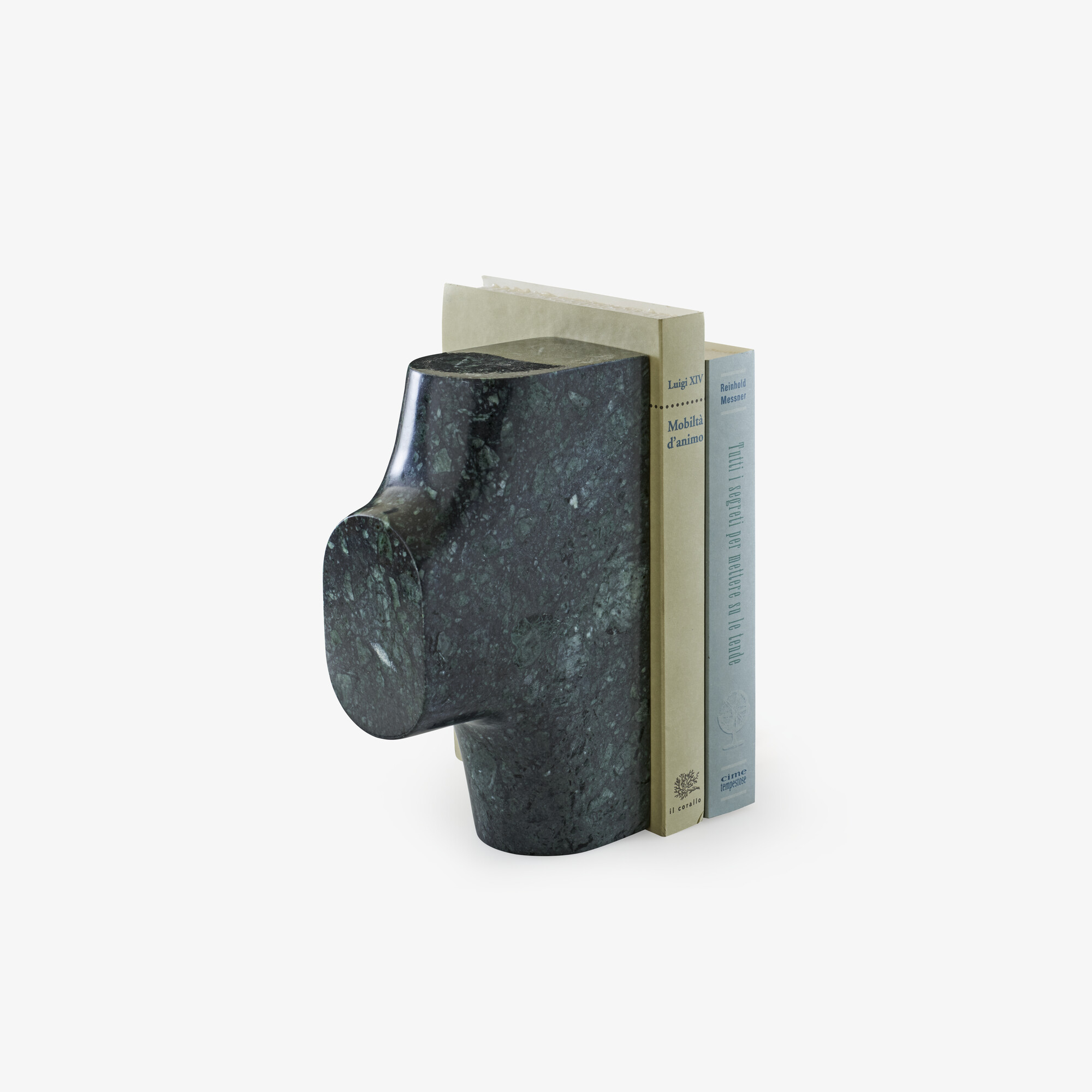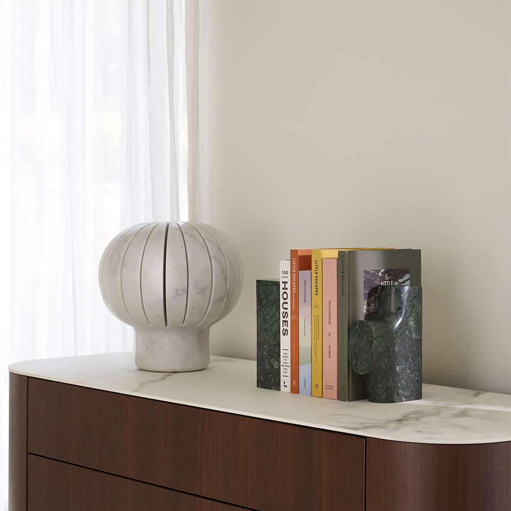 Rami -kirjatuen veistoksellinen muotoilu ja marmorin huoliteltu viimeistely tuo kirjahyllyyn tai sivupöydälle ripauksen käytännöllistä kauneutta. Voidaan käyttää pystyssä tai kyljellään. Saatavilla kahdessa värissä: Musta ja Vihreä. Koko: L 20 x S 6 x K 12 cm.