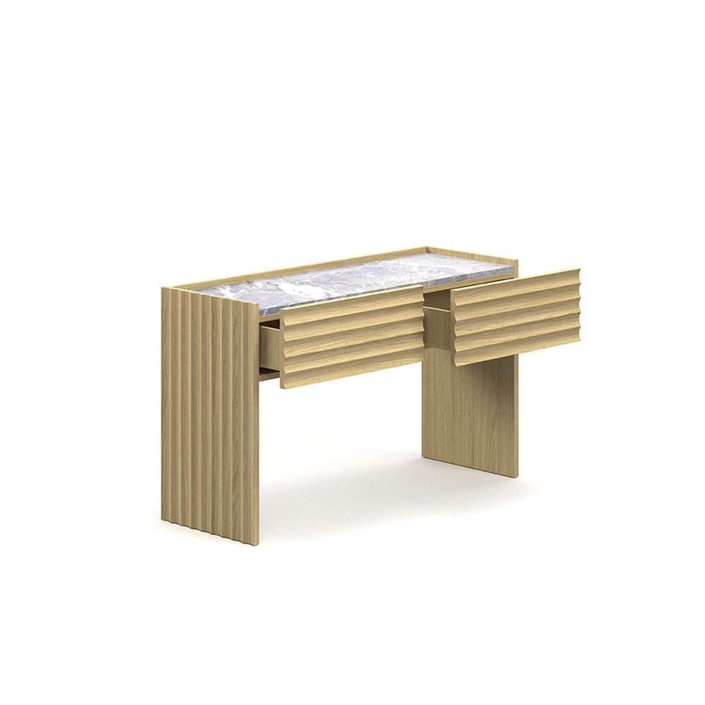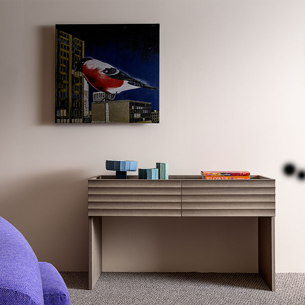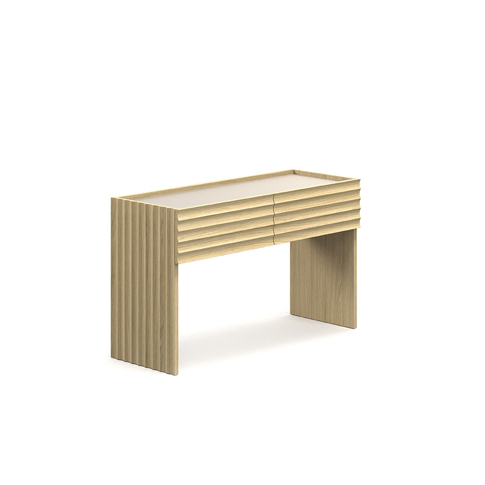 ... Lue lisääRows-malliston on suunnitellut Patricia Urquiola Morosolle. Rows-tuotesarjaan kuuluu senkki, kaappi sekä konsoli- ja ruokapöytä. Mallisto ilmentää koristeellista käsityötaitoa, jossa kaareva jyrsintä luo sille tunnusomaisen ilmeen. Rows konsolin runko on viilupuuta ja kanteen on saatavilla lasi- tai marmorivaihtoehdot. Jalat on korkeussäädettävissä liukunastoilla. Konsolin mitat ovat 120 x 45 x 72 cm.